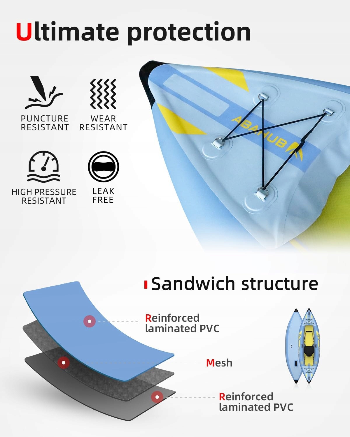 Kajaki Abahub są wykonane z wytrzymałych materiałów winylowych z dnem typu Drop-Stitch, aby zwiększyć sztywność, które wytrzymują nieoczekiwane warunki na zewnątrz. Kontraktor 3-komorowy zapewnia dodatkowe bezpieczeństwo. Zawory Halkey-Roberts wytrzymują lepsze ciśnienie, są łatwe w obsłudze i nie wyciekają. Kilka zabezpieczeń, które pomagają Ci bezpiecznie uprawiać kajakarstwo