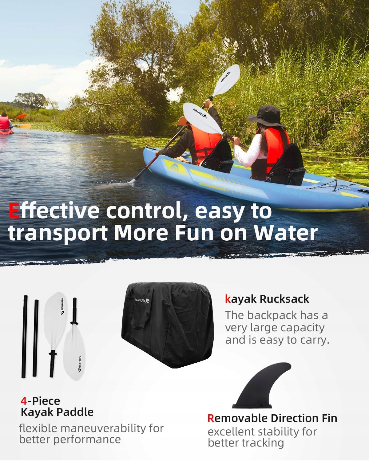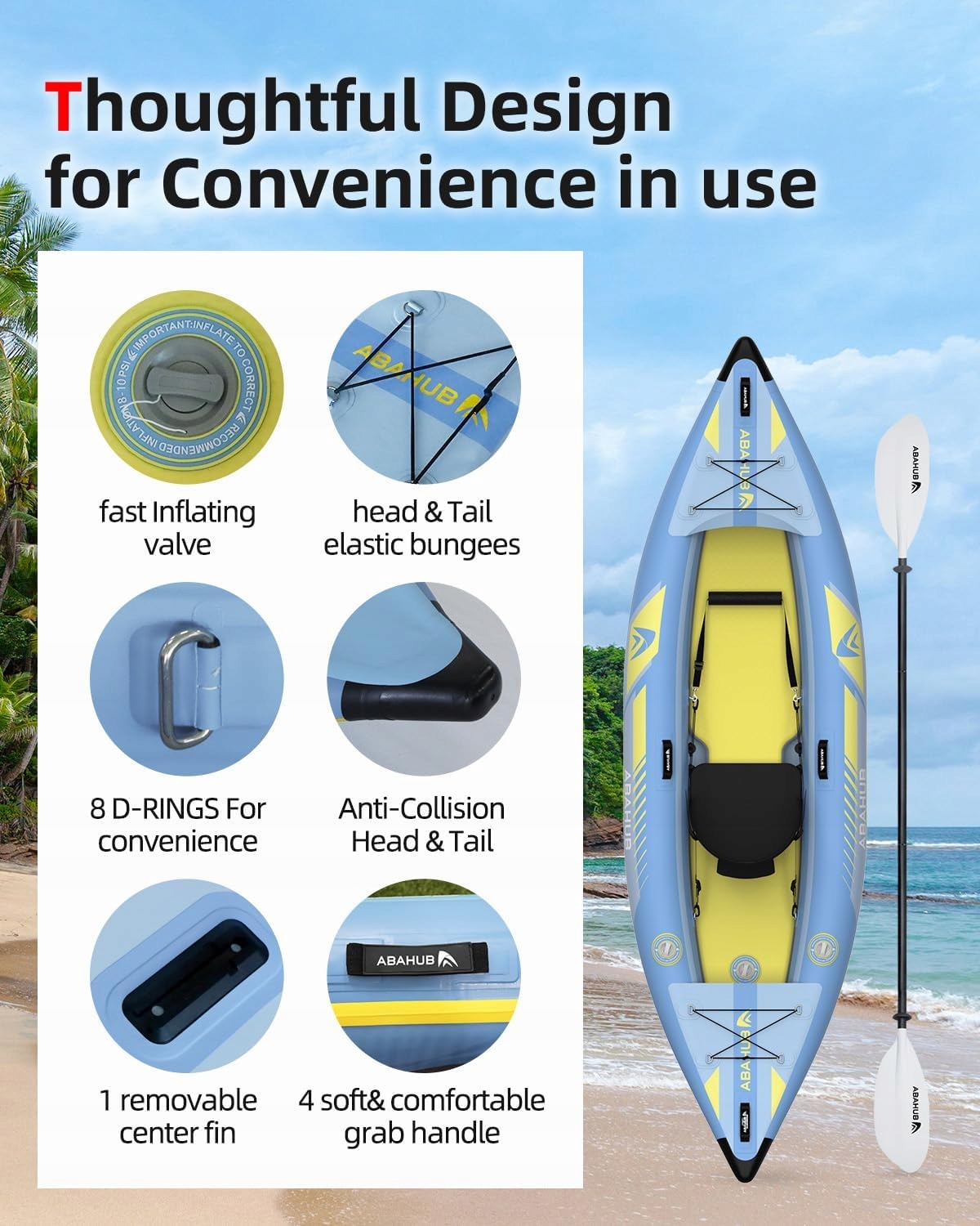 Łatwe nadmuchiwanie i opróżnianie za pomocą zaworów Halkey-Roberts, łatwe czyszczenie dzięki zdejmowanej konstrukcji dna. Rdzeń Drop-Stitch o wysokiej gęstości zapewnia sztywność, zdejmowana płetwa kierunkowa zapewnia doskonałą stabilność, aby poprawić wydajność pływania kajakiem, 4-częściowe wiosło kajakowe jest również łatwe w obsłudze. Doskonała manewrowość i stabilność pozwalają cieszyć się wodą