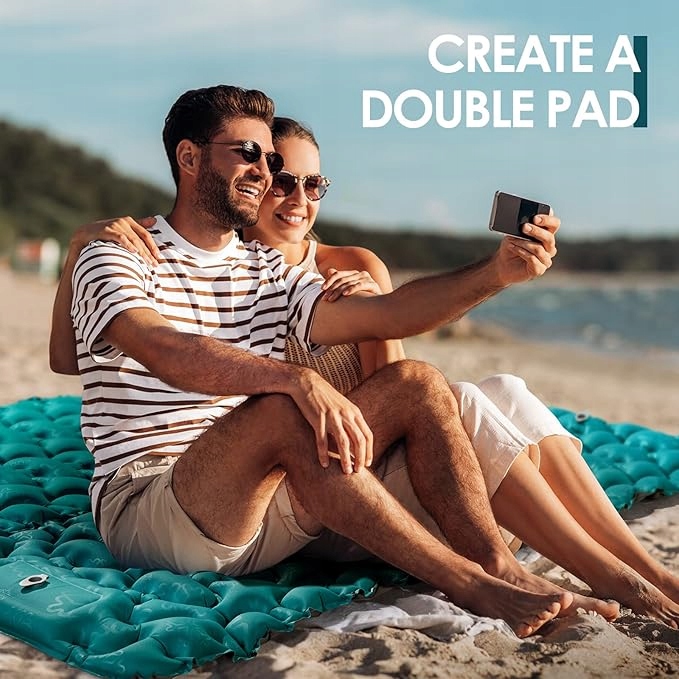 - Jedyne w swoim rodzaju wzornictwo z możliwością łączenia – każda nadmuchiwana karimata jest wyposażona w zatrzaski po bokach, dzięki czemu można połączyć ze sobą dwie maty do spania, aby stworzyć podwójne łóżko zapewniające bardzo dużo miejsca. Idealny do różnych aktywności na świeżym powietrzu, szczególnie odpowiedni dla par lub rodzinnych podróży