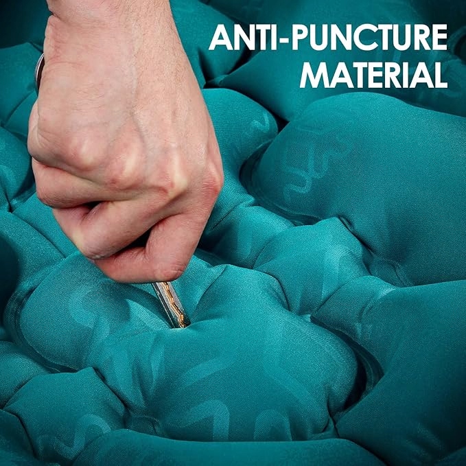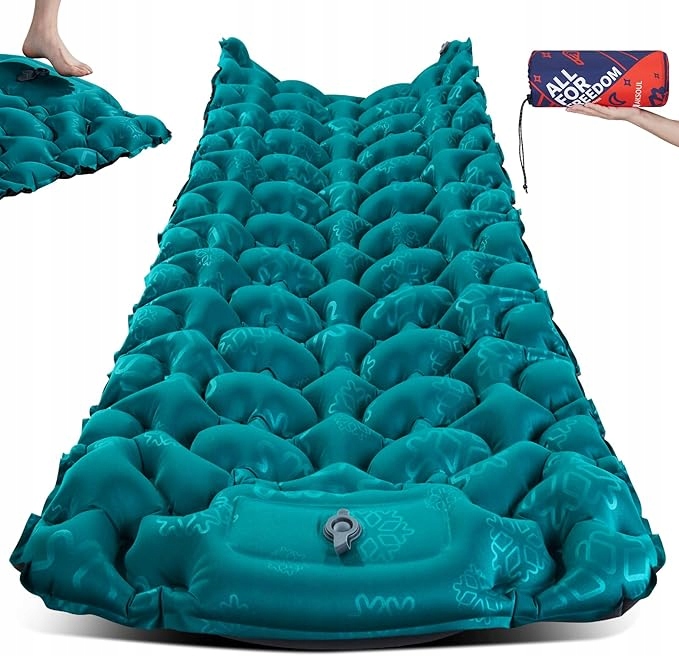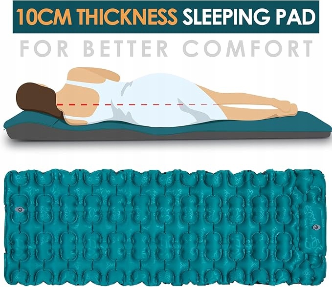 - Poduszka i grubość 8 cm dla wsparcia snu – nasza lekka podkładka do spania jest grubsza i szersza w porównaniu z innymi podobnymi produktami. Grubość 10 cm po nadmuchaniu można izolować od zimnego podłoża, wilgotnego podłoża i twardych kamieni. Ponadto ergonomiczna konstrukcja z poduszką powietrzną wygodnie podpiera i zaspokoi różne pozycje snu. Odpocznij i bądź przygotowany na przygodę następnego dnia