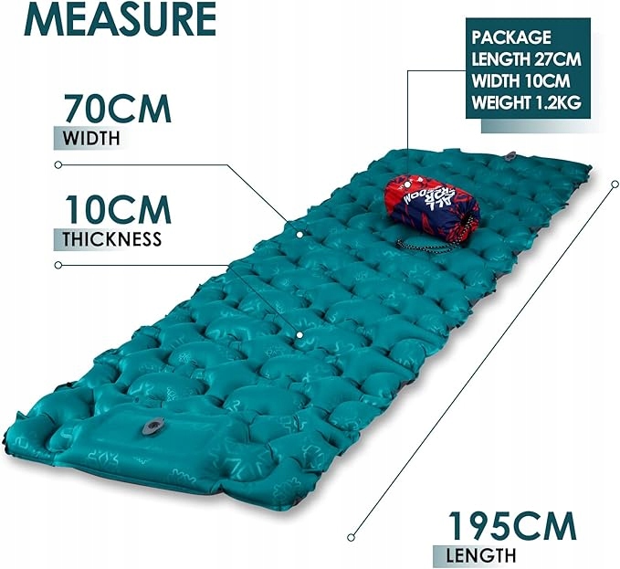 - Ultralekki i przenośny – lekki materac dmuchany mierzy 195 x 70 x 10 cm po nadmuchaniu i 27 x 10 cm po złożeniu i waży ok. 1200 g, przenośny do podróży, na kemping, do trekkingu, wędrówek, wędrówek z plecakiem itp