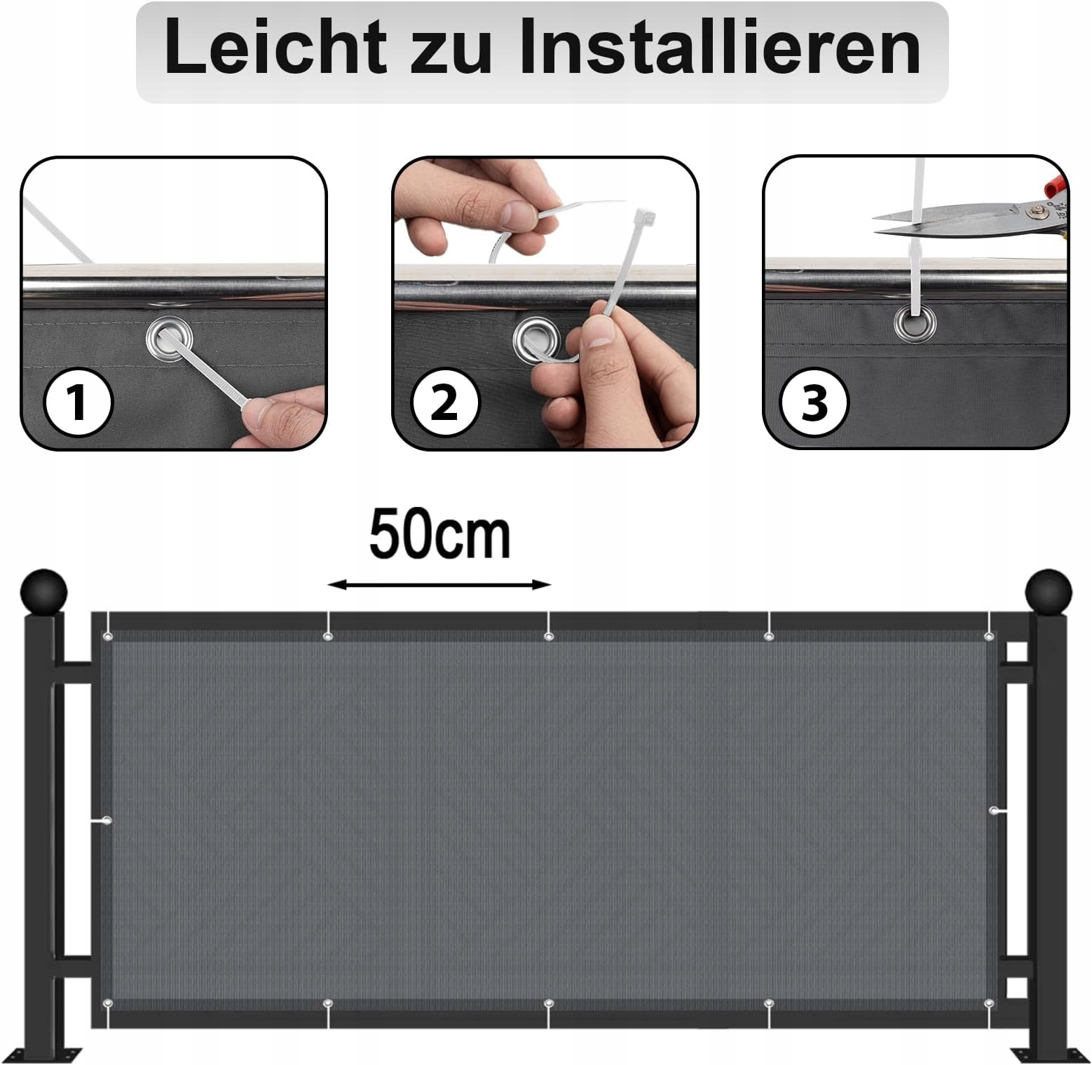 Montaż osłony balkonowej AXT SHADE jest niezwykle prosty i intuicyjny. Produkt wyposażony jest w solidne aluminiowe oczka rozmieszczone co 50 cm, które umożliwiają łatwe i pewne przymocowanie osłony do balustrady balkonowej za pomocą dołączonych do zestawu sznurków oraz opasek kablowych. Dzięki temu, w krótkim czasie możesz cieszyć się odmienionym wyglądem swojego balkonu, zyskując jednocześnie dodatkową prywatność i ochronę.