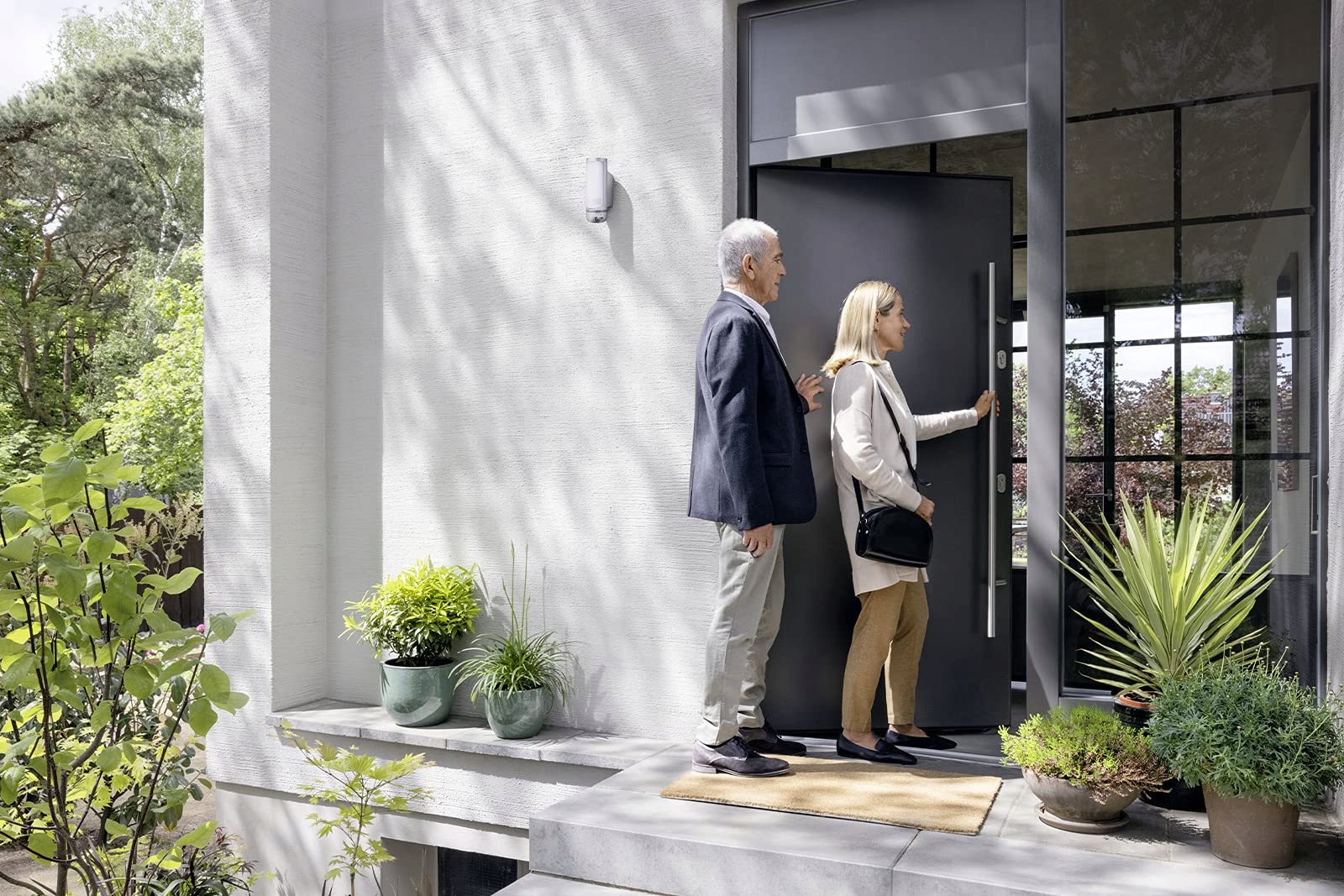 W połączeniu z kamerą zewnętrzną Bosch Eyes zawsze masz oko na to, kto stoi przed drzwiami: jesteś natychmiast informowany i widzisz bezpośrednio, kto stoi przed drzwiami i możesz łatwo przyznać dostęp swoim gościom – nawet jeśli nie są w domu.
