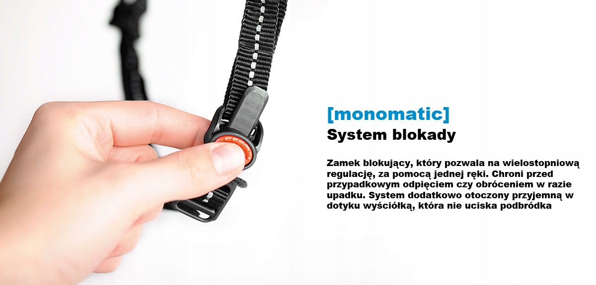 System Monomatic-to zamek blokujący, który pozwala na wielostopniową regulację paska podbródka za pomocą jednej ręki