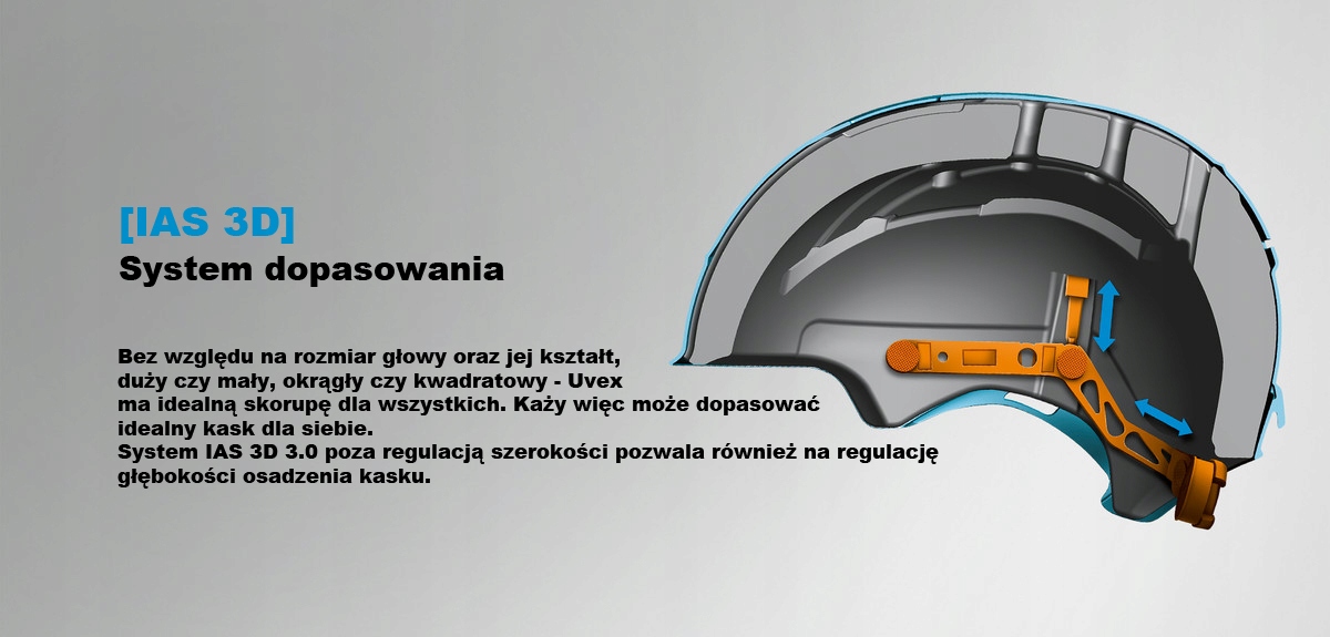 Ruchomy system IAS, który pozwala na dopasowanie kasku do kształtu głowy za pomocą jednej ręki