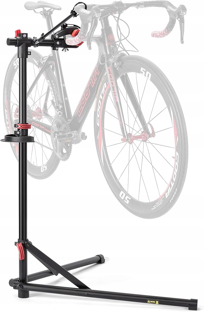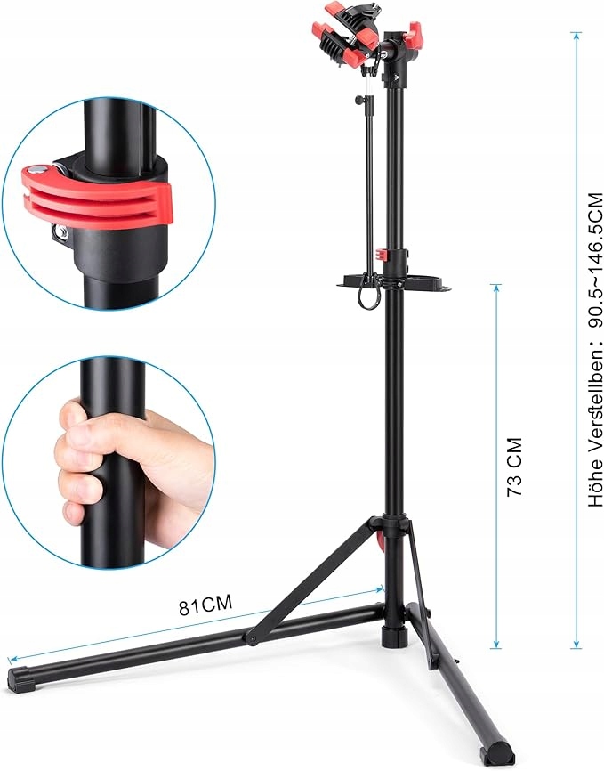 zacisk za pomocą dźwigni może bardzo stabilnie zamocować rower. Dzięki drążkowi teleskopowemu ten stojak montażowy ma regulowaną wysokość, dzięki czemu talia jest przyjemna podczas naprawy.