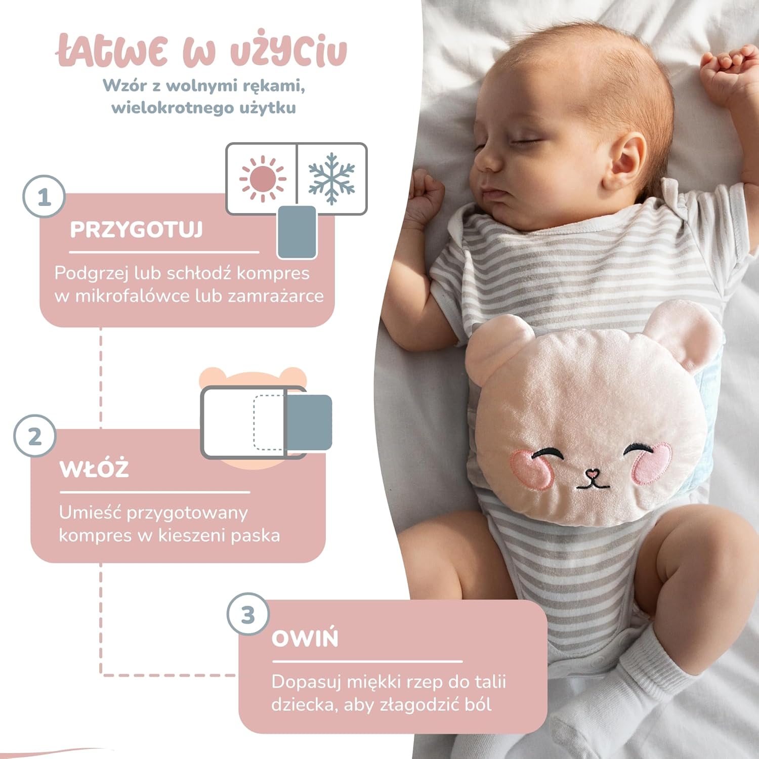 Zapomnij o trzymaniu tradycyjnego termoforu ręką. Nasz specjalnie zaprojektowany pas sprawia, że kojące ciepło trafia dokładnie tam, gdzie jest potrzebne – na brzuszek maluszka – i pozostaje tam, nawet gdy dziecko się porusza.