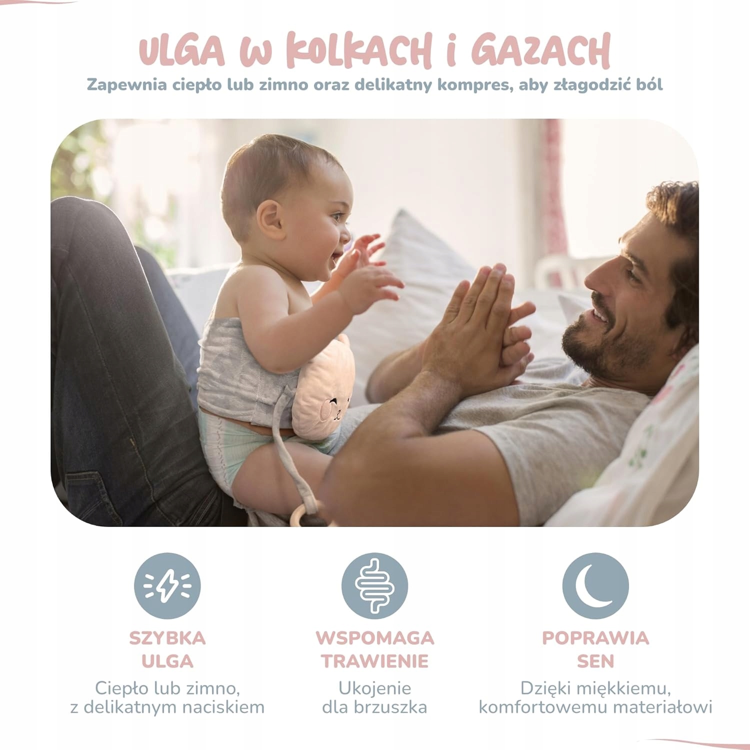 - Swoboda ruchów: Dziecko może swobodnie wierzgać nóżkami, a termofor pozostaje na swoim miejscu, delikatnie ogrzewając i masując bolące miejsce.