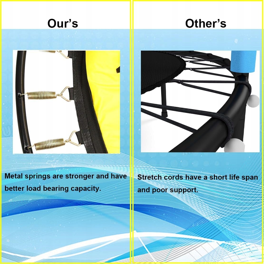 Stabilność trampoliny to podstawa energicznej zabawy. Konstrukcja opiera się na 6 wzmocnionych stalowych nogach oraz dwuwarstwowej metalowej ramie wspierającej, co skutecznie zapobiega przewróceniu się na boki. Solidna i wytrzymała budowa gwarantuje bezpieczne użytkowanie. Całkowita waga trampoliny wynosząca około 13 kg ułatwia transport i przestawianie, dzięki czemu można ją łatwo przenosić z ogrodu do wnętrza domu, niezależnie od pogody.